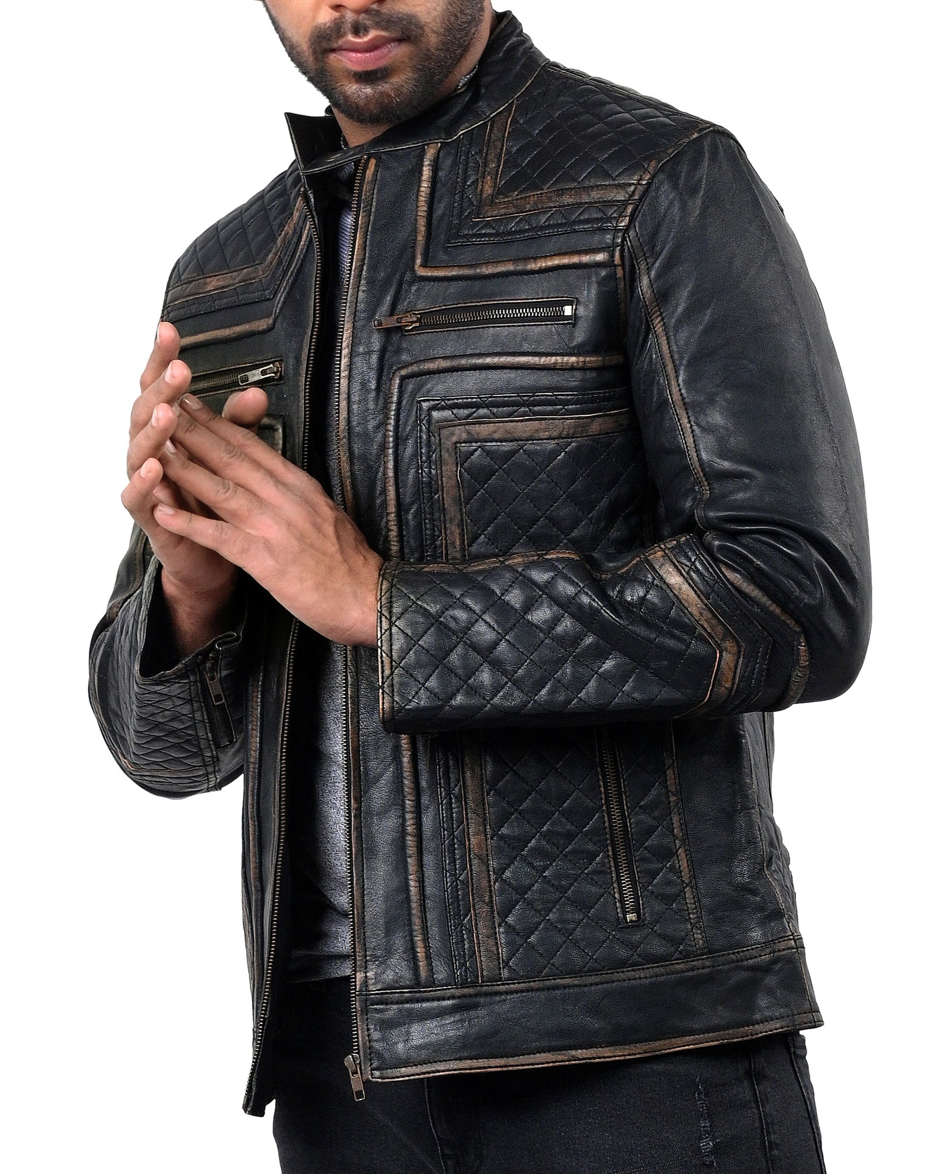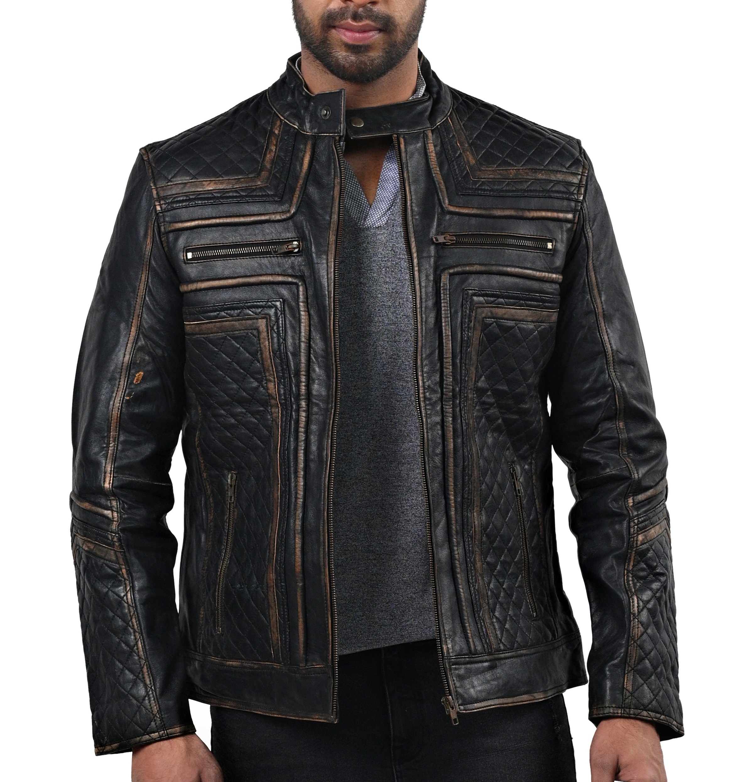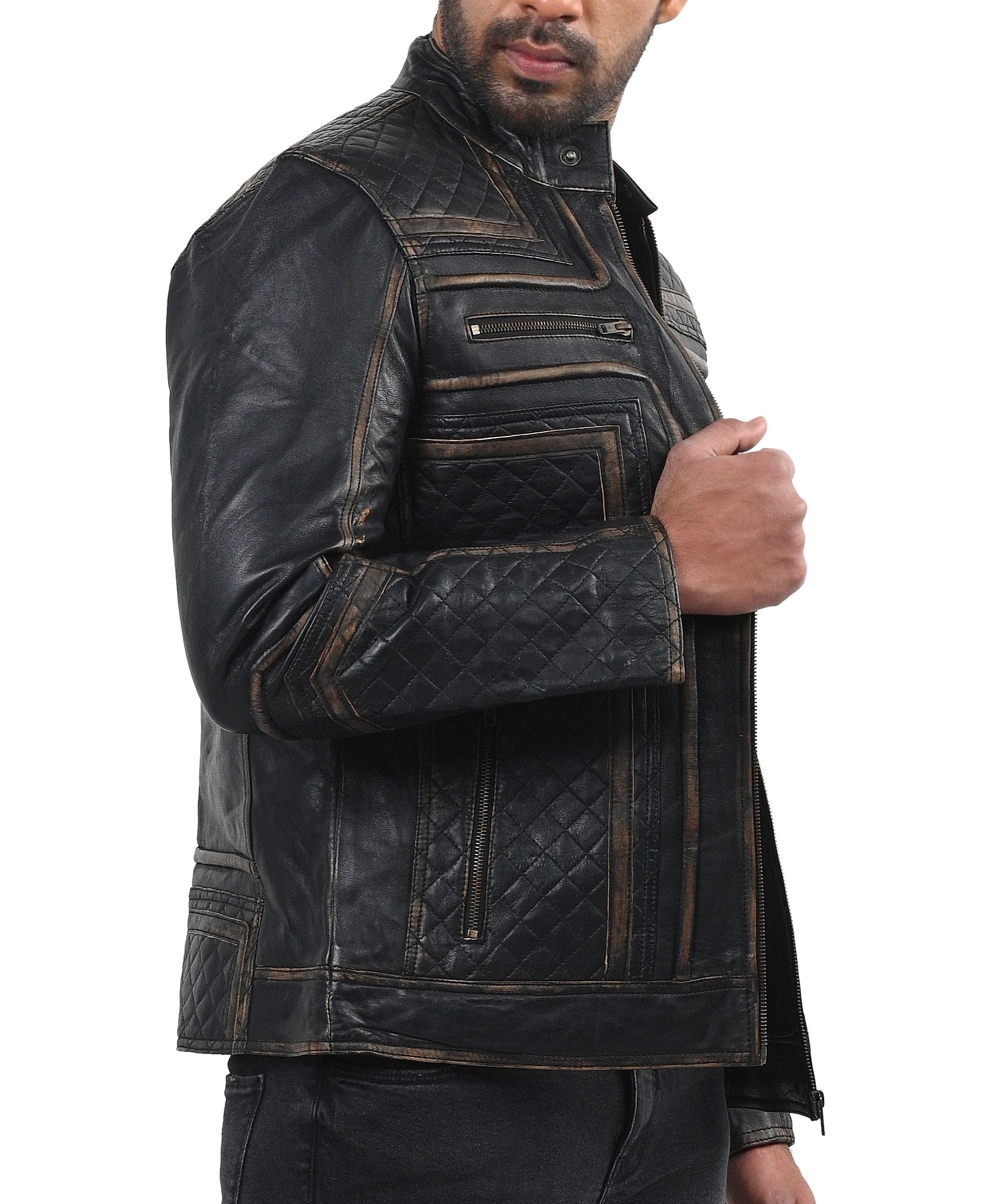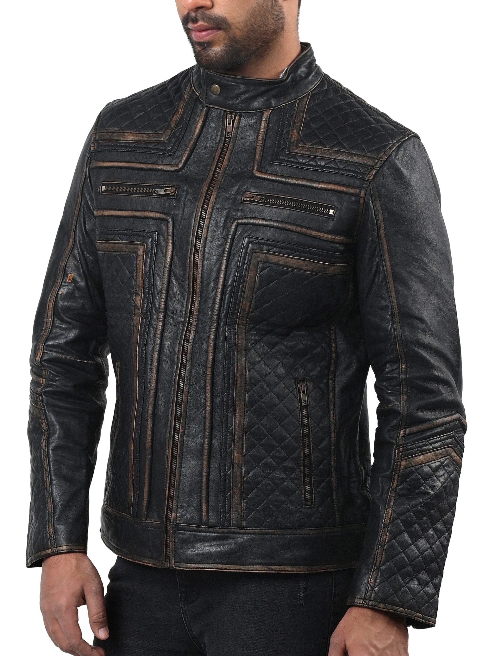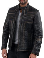 Our Genuine Sheep Rubbuf Leather jacket lets you experience the pinnacle of attitude and style. This jacket’s superb quality sheep leather, which emanates luxury and durability, was expertly crafted with care. Any outfit is made more sophisticated by the sleek black hue, making it a viable option for many events. A quilted viscose lining inside offers the utmost comfort and insulation, keeping you warm even on chilly days. The round neck collar with button detailing gives a touch of originality and trendiness, while the zipper fastening makes it more convenient and guarantees a tight fit. The jacket’s numerous pockets and motorcycle pattern, which embodies the spirit of adventure, was designed with utility in mind.