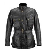 Made from genuine lambskin leather this men’s black roadmaster leather jacket is the David Beckham style jacket. We made this jacket taking inspiration from the Belstaff. The leather biker jacket has a belted waist. There are 4 box pockets in the outfit. 2 chest pockets and 2 side pockets. The collar is buckle style while there is button closure on the front.
