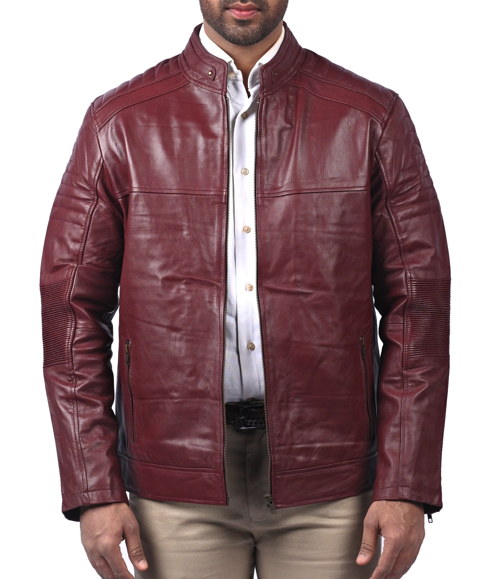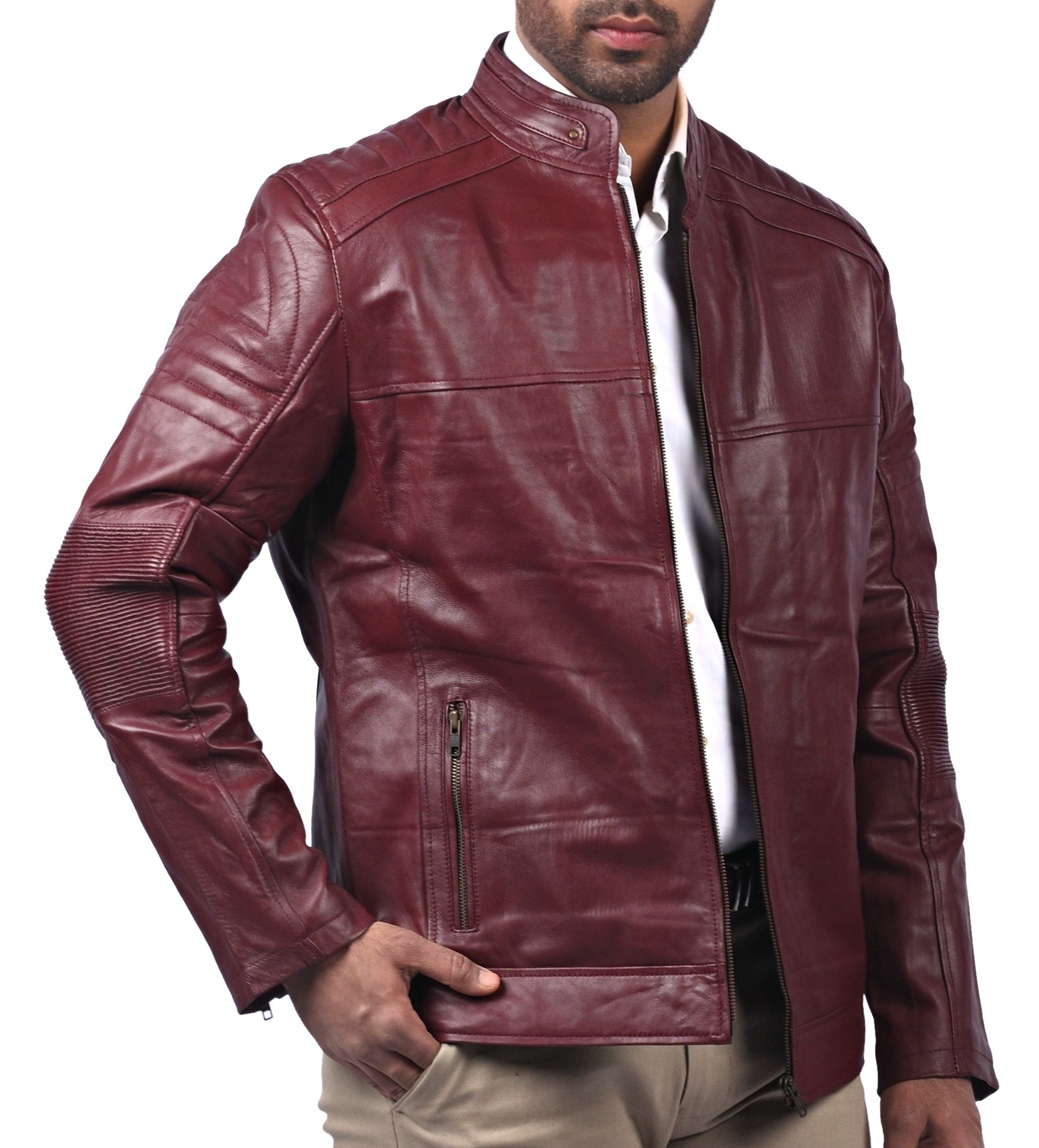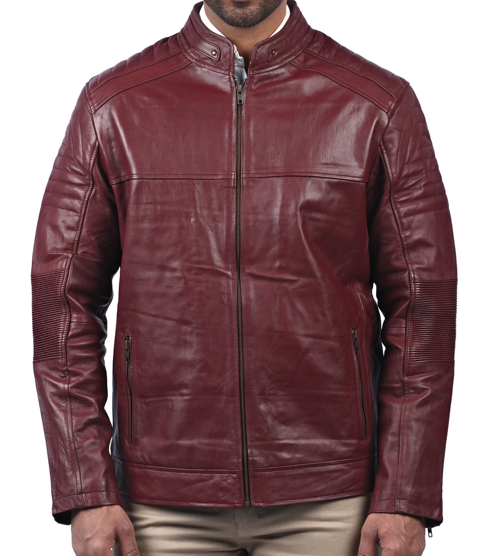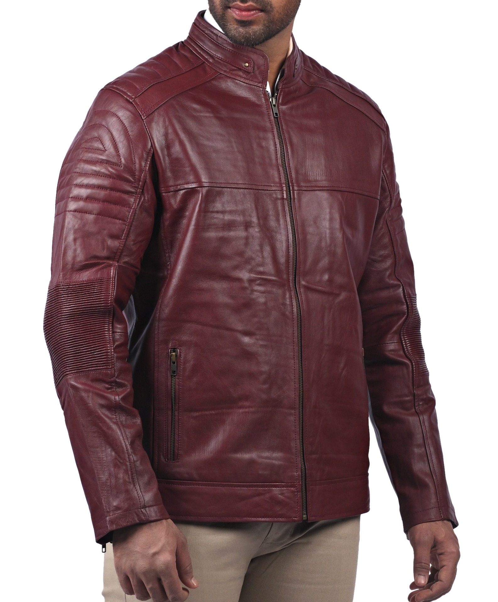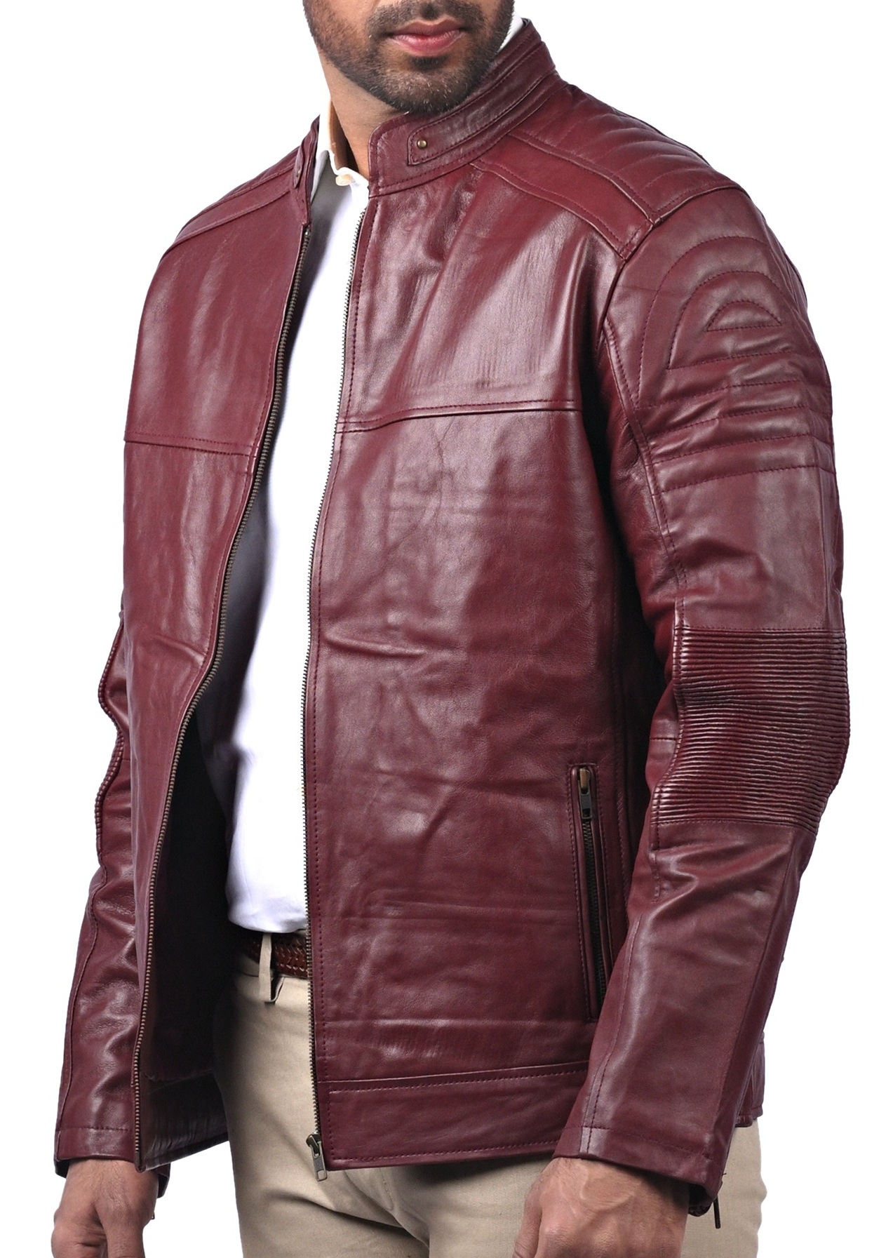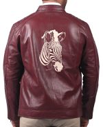 Command attention with a refined take on biker style. This men’s maroon cafe racer leather jacket is crafted from genuine sheepskin leather and finished with a distinctive zebra print graphic on the back—bold, modern, and wearable.