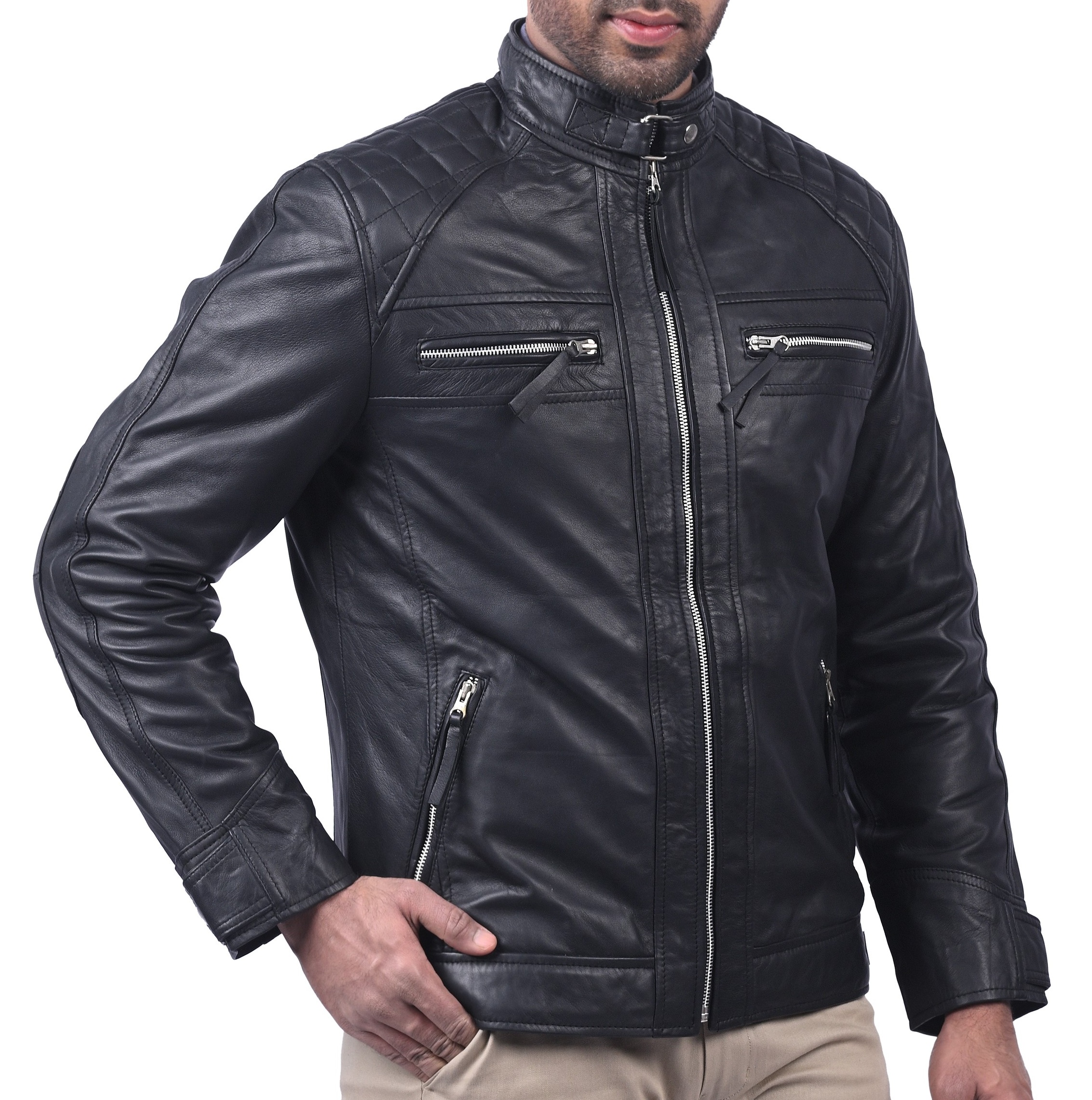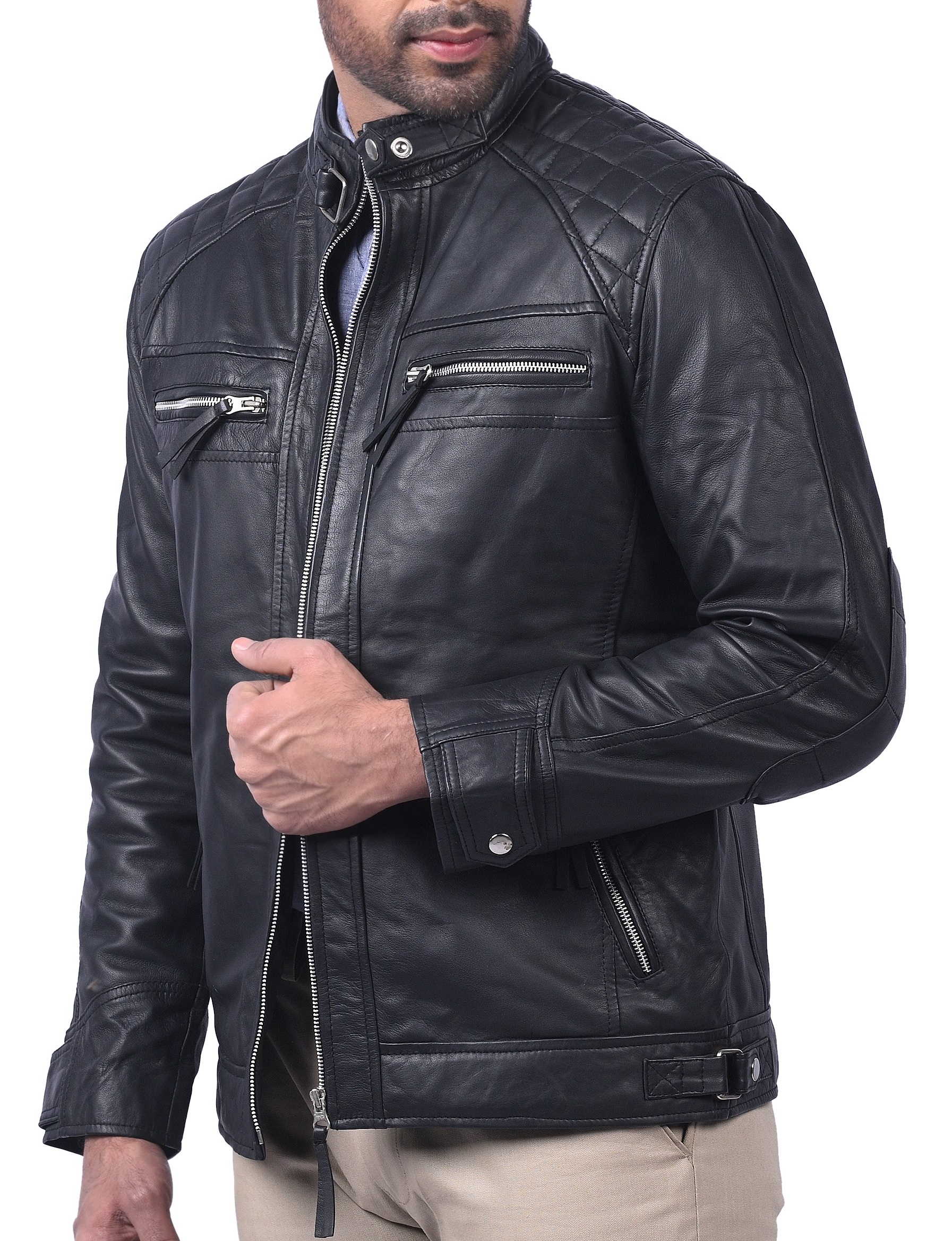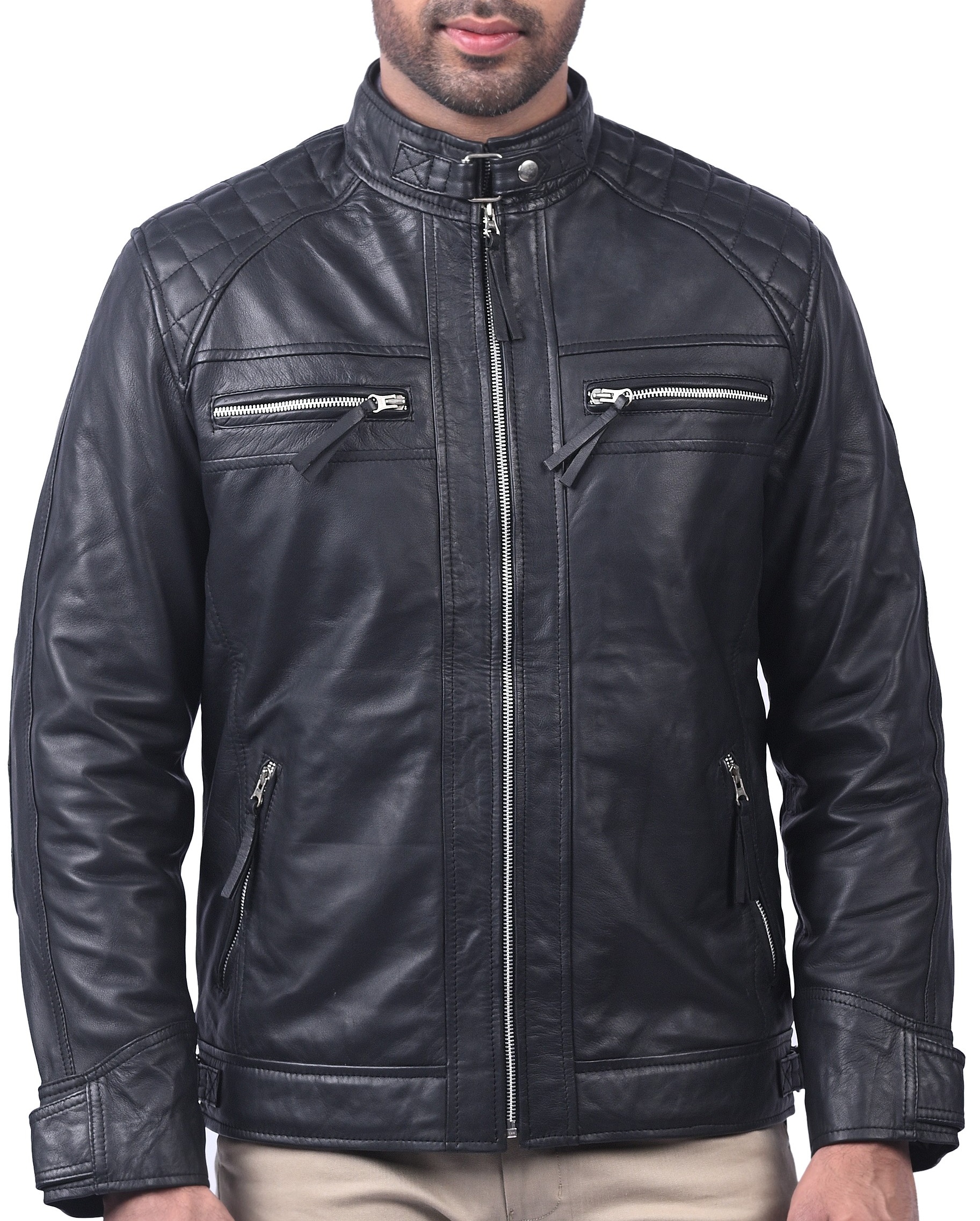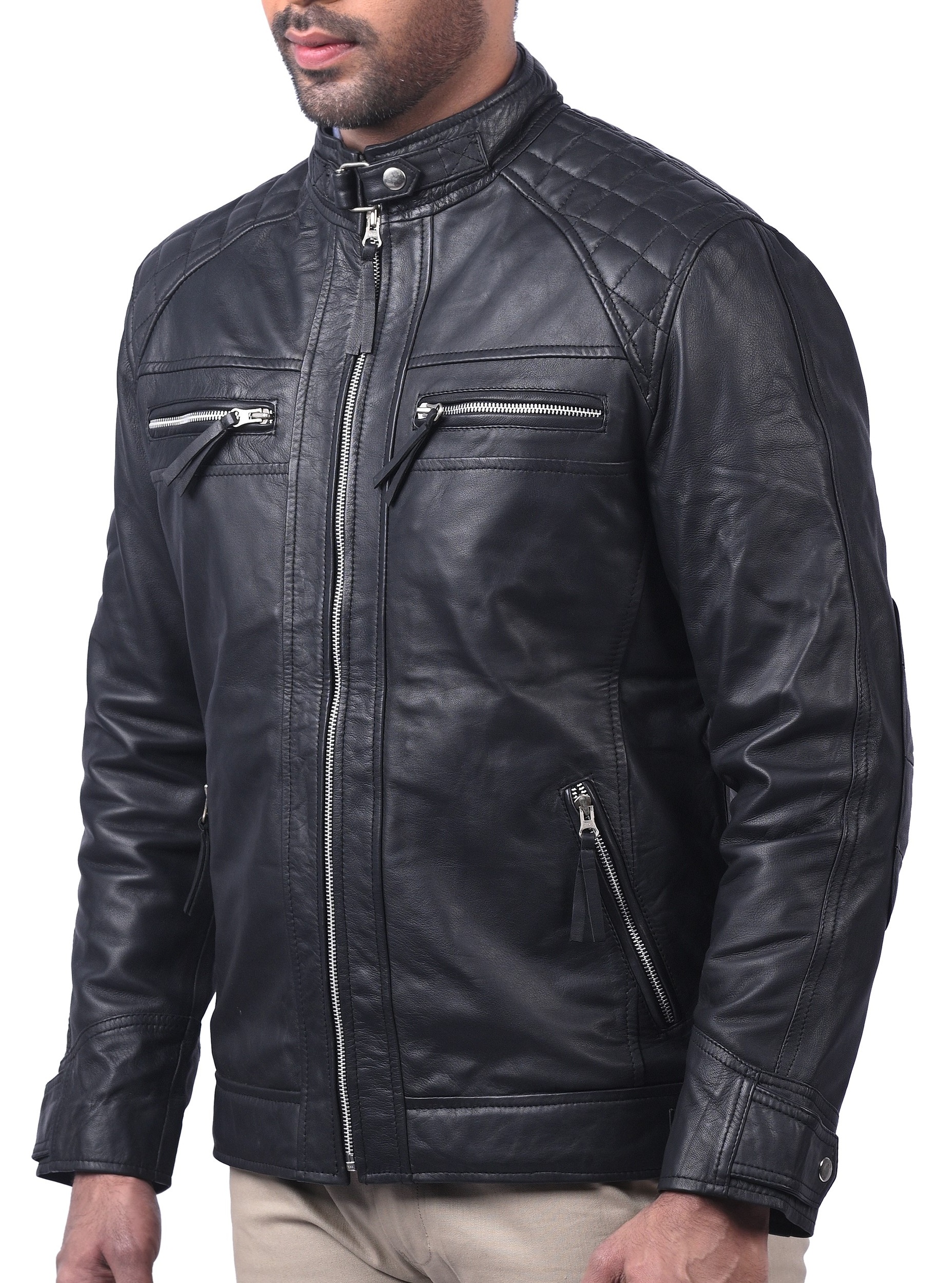 The Men’s Café Racer Motorcycle Quilted real sheep waxed Leather Jacket is one of the Café Racer Leather Jackets. The Jacket itself is comprised of 100% real & premium quality leather, it has a soft viscose lining on the inside to give you a sense of warmth & comfort, it has full-length sleeves with open hem cuffs, the front side of the jacket is open with Zipper closure option, plus it has multiple zipper-pockets two of which are on the chest & two are on the waist. There are also two internal pockets the collar is round and closes with buttons for Casual And Formal Purposes, Add This Leather Jacket To Your Wardrobe. A Totally Comfortable Look Jacket To Pair With Jeans And T-Shirt, 100% Real Sheep Leather Jacket is Perfect Outerwear For Everyday Style Routine.