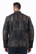 Mens black distressed leather jacket front view with padded panels