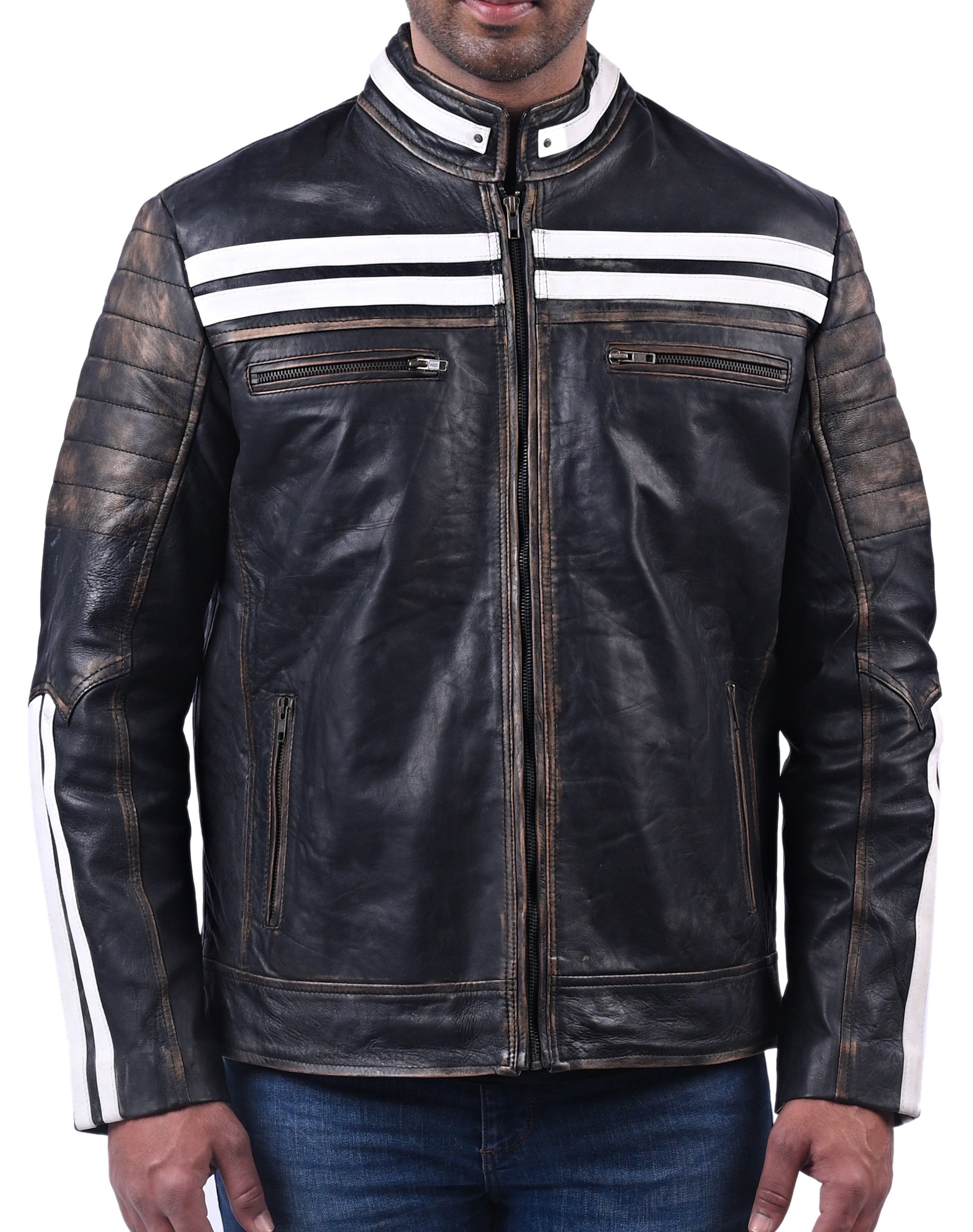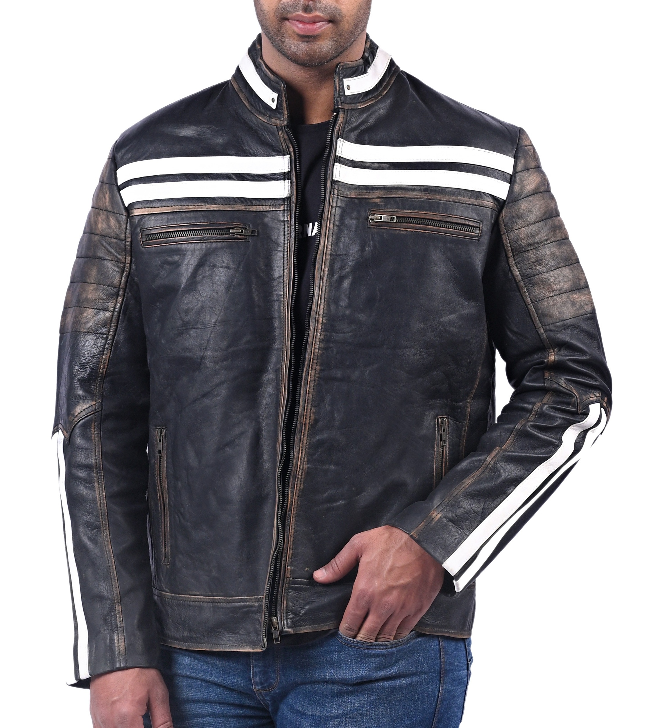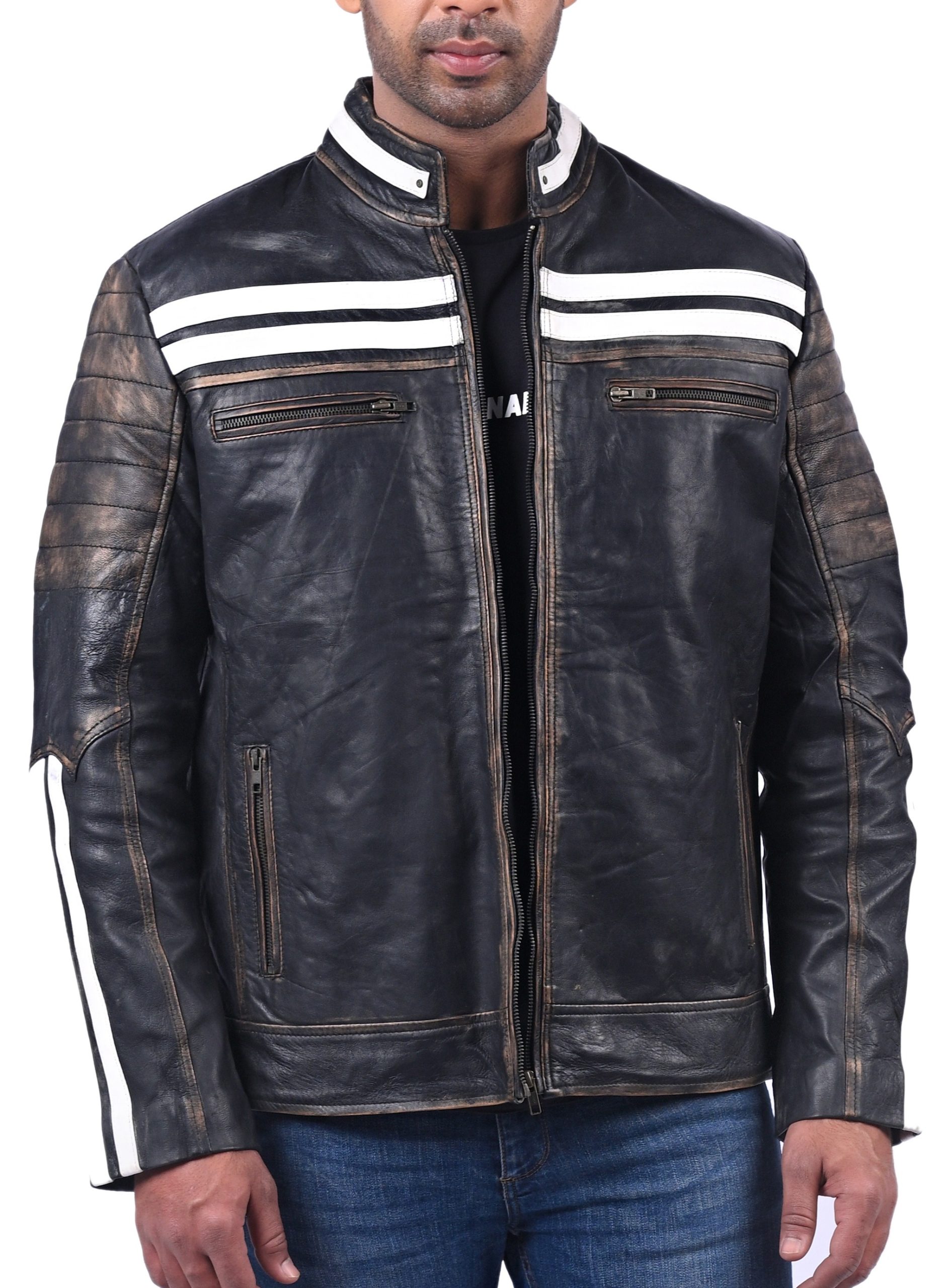 Black Distressed Penetrated Real Cow Leather Jacket For Men Is Prepared With Genuine Full Grain Cow Leather. Hand Distressed Finishing On This Black Jacket With White Stripes Accentuate The Outfit To A Total Head-Turner. It Features Front Zipped Closure With Finely Stitched Stand Collar And 4 Spacious Zipper Pockets. The Real Leather And Inner Premium Viscose Lining Provides Comfort And Durability In All Weathers Making It Suitable for Riding.