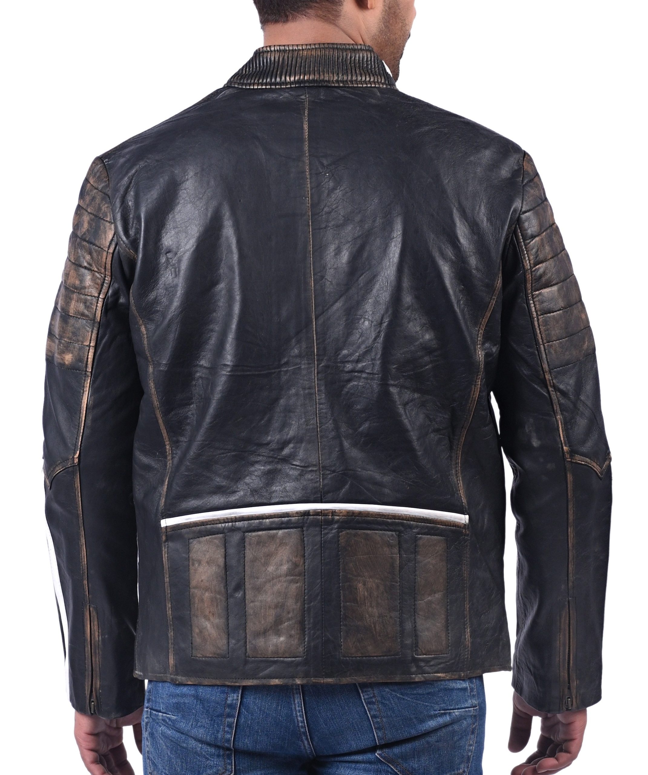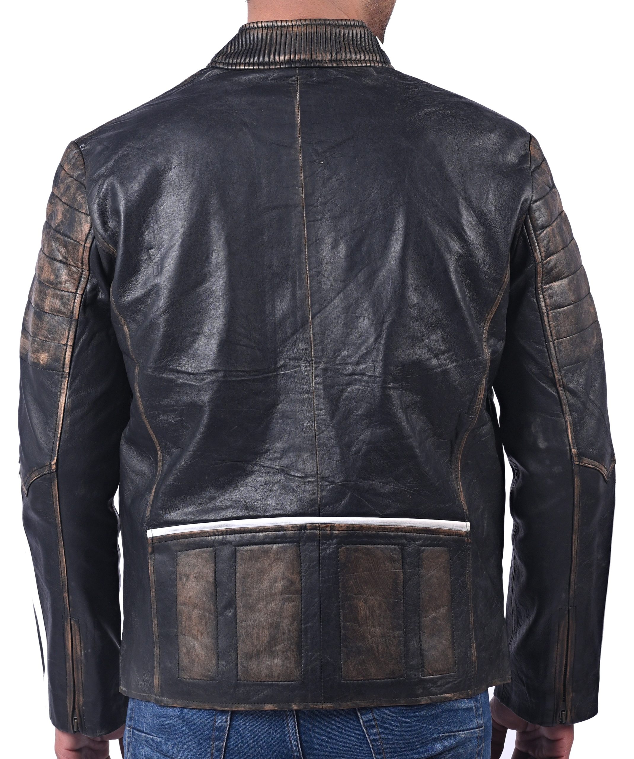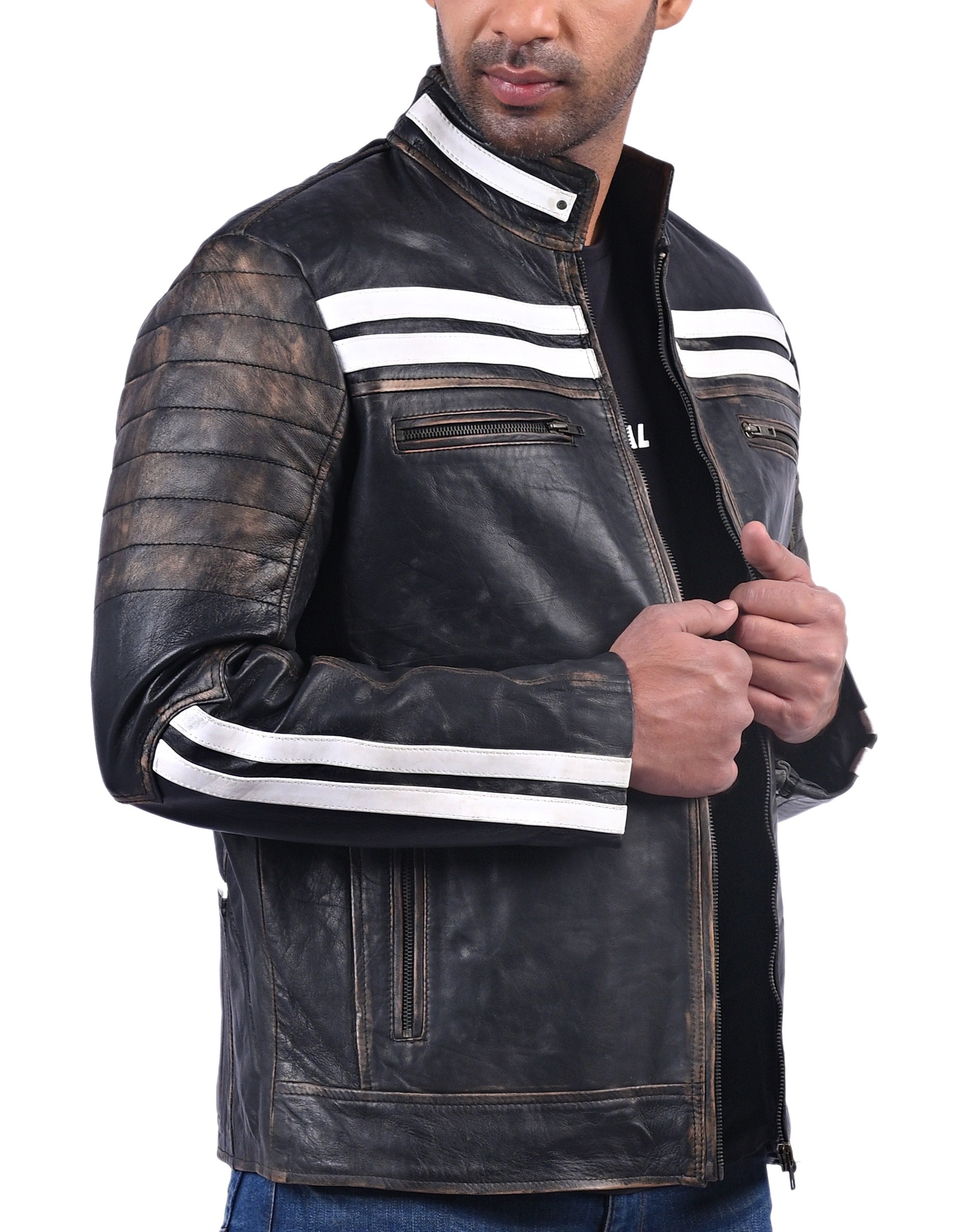 Black Distressed Penetrated Real Cow Leather Jacket For Men Is Prepared With Genuine Full Grain Cow Leather. Hand Distressed Finishing On This Black Jacket With White Stripes Accentuate The Outfit To A Total Head-Turner. It Features Front Zipped Closure With Finely Stitched Stand Collar And 4 Spacious Zipper Pockets. The Real Leather And Inner Premium Viscose Lining Provides Comfort And Durability In All Weathers Making It Suitable for Riding.