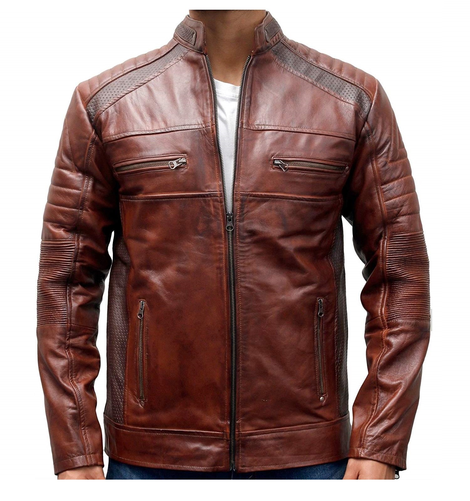 If you a cafe racer fan then you definitely want to buy this men’s brown leather cafe racer jacket. The biker style leather jacket is of brown color with waxed finishing. The outer material of the jacket is real leather. From the inner side, however, we used viscose lining. For making the motorcycle outfit comfortable for wear. Furthermore, the brown leather biker jacket has 2 hand and 2 chest zipper pockets.