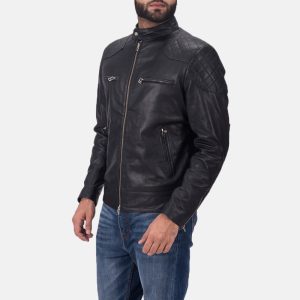 A stand style collar keeps the neckline structured and modern. The padded shoulder detail adds shape through the upper body and gives the jacket a stronger biker profile. The front zip closure keeps the silhouette neat and makes layering simple.