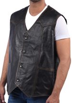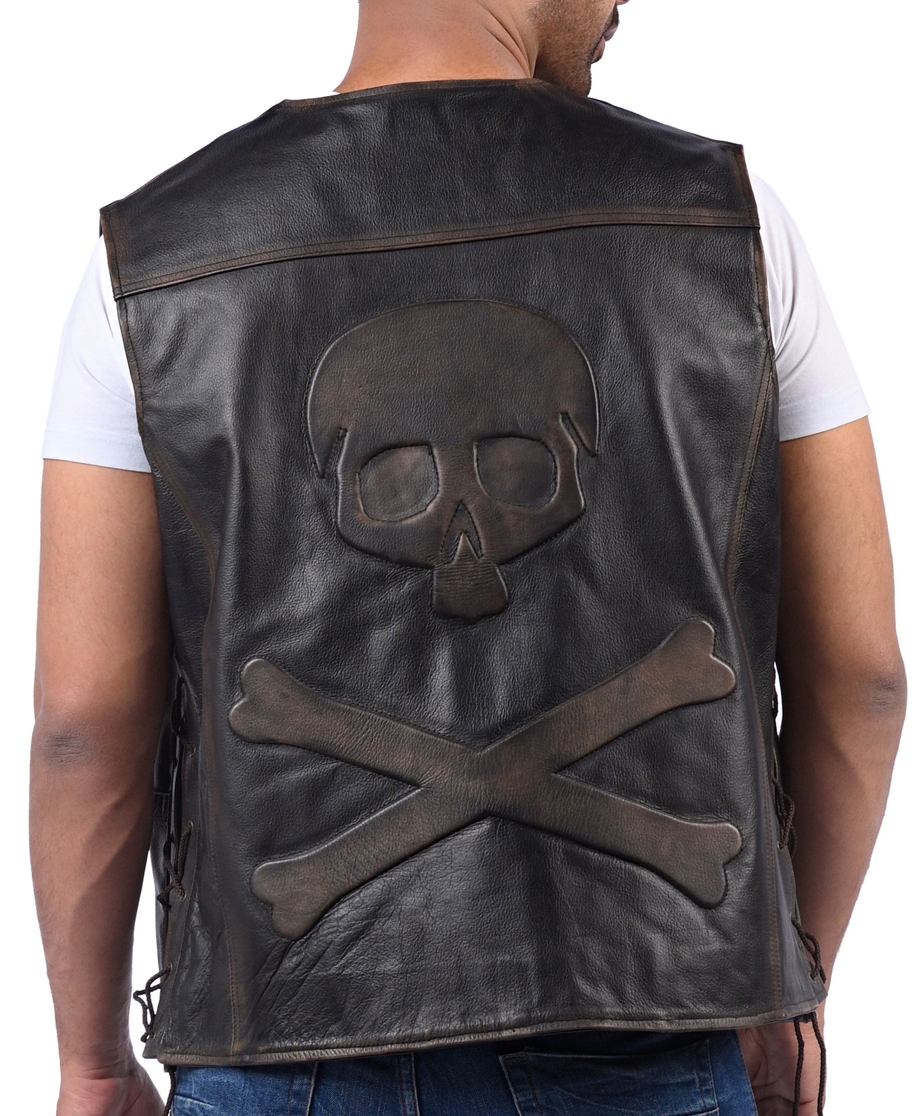 Make a bold statement with a leather vest designed for presence and longevity. Crafted from real cowhide leather in a deep black finish, this piece delivers a premium feel with a standout skull-and-bones embossed back panel. Inside, a soft luxury lining keeps it comfortable for extended wear, while the button-front closure and clean edges give it a timeless, well-built look.