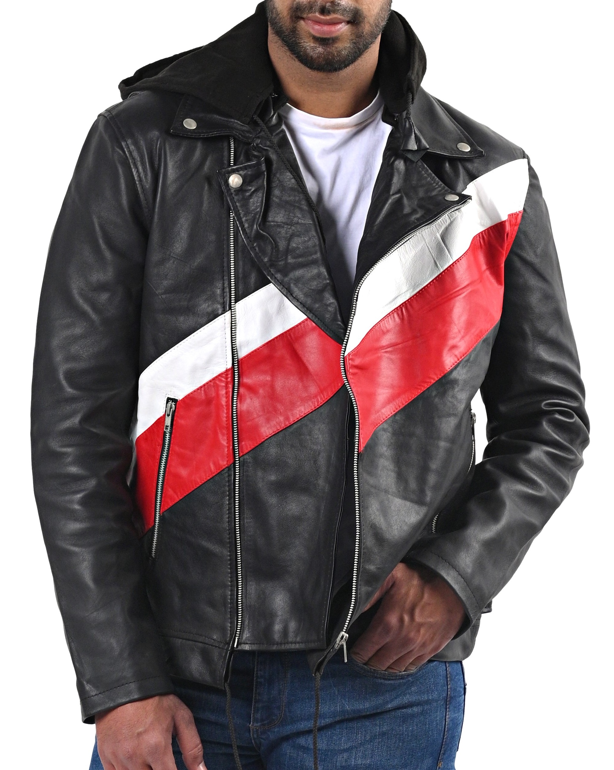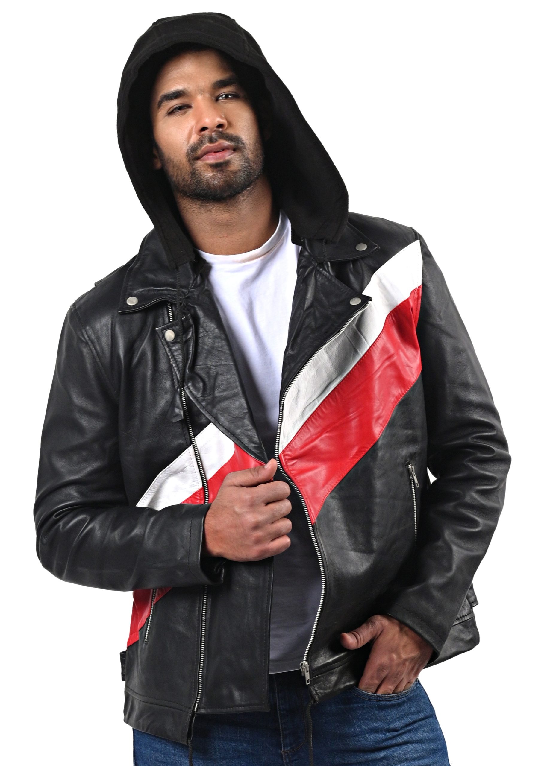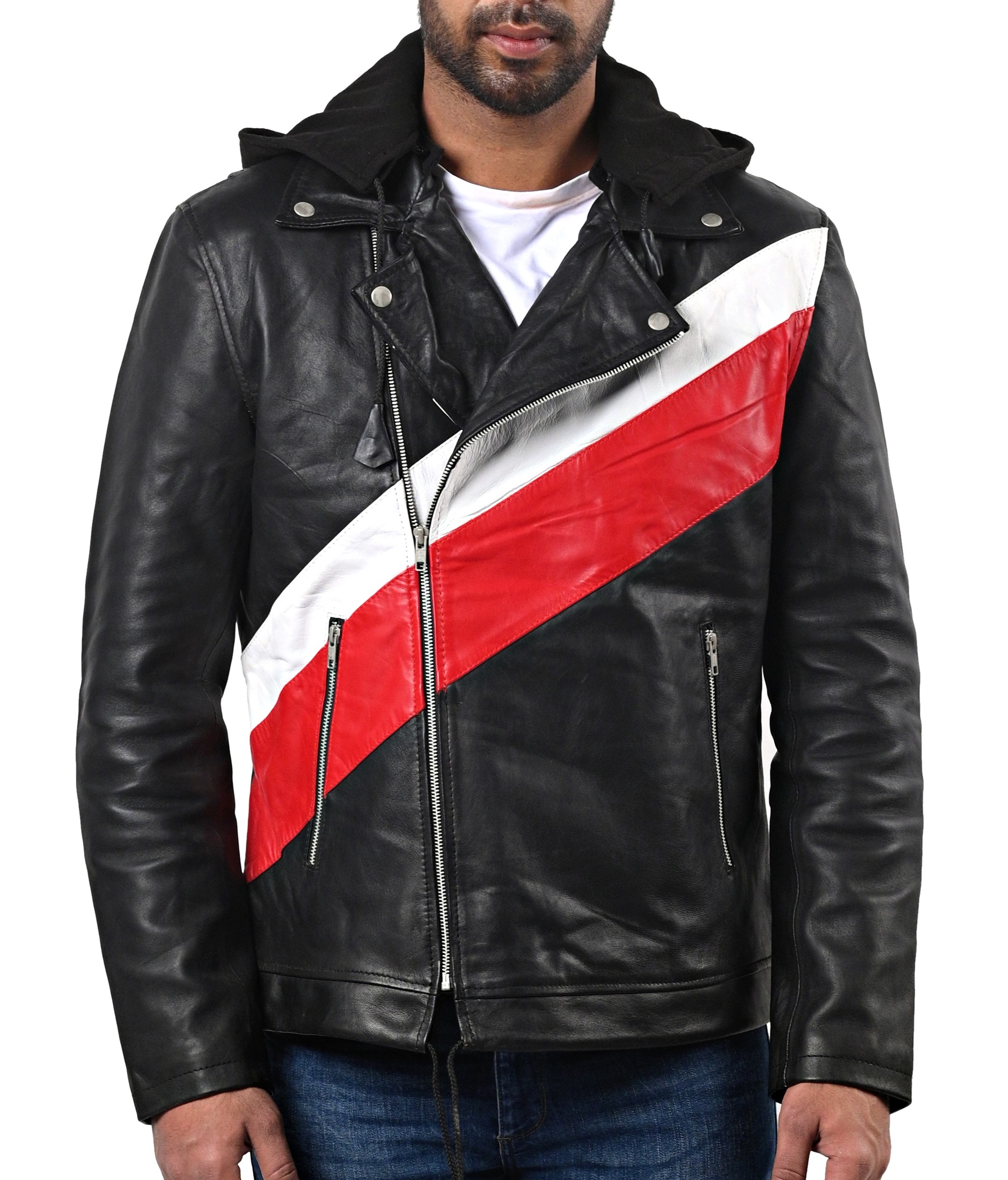 Sharp, modern, and built to turn heads—this leather jacket delivers a statement look with everyday wearability. Crafted from genuine leather and finished in a striking black/white/orange colour-block design, it blends biker attitude with a contemporary street-style edge. The attached hood adds a layered aesthetic, while the soft viscose lining keeps it comfortable from day to night.